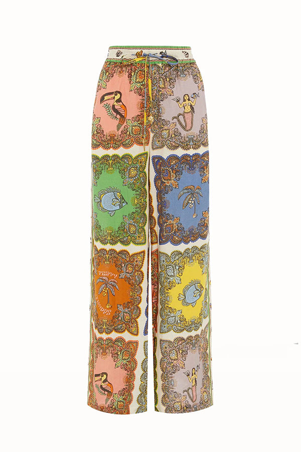 Sunny Delights Linen Blend Mermaid Print Elastic Waist Pocketed Wide Leg Pants