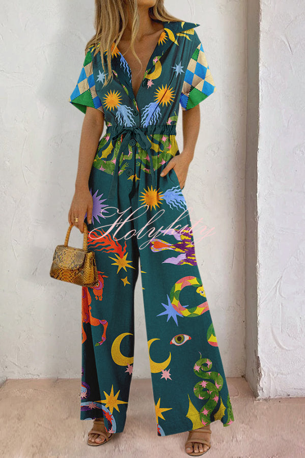 To New Hellos Linen Blend Unique Print Adjustable Waist Pocketed Wide Leg Shirt Jumpsuit